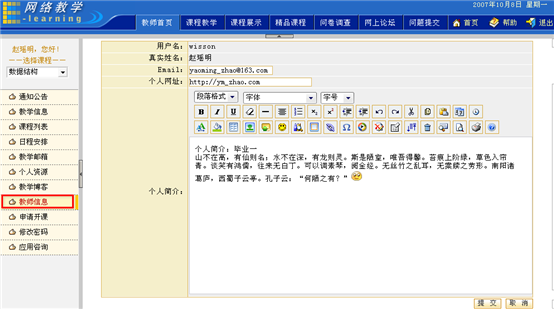 教师信息显示了教师的个人信息,包括用户名、真实姓名、Email、个人简介等信息。教师可以对个人信息进行浏览和修改。