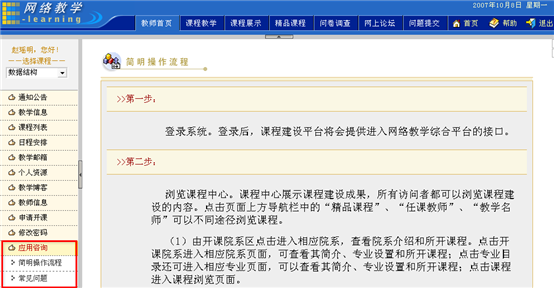 进入教师首页,点击左侧菜单中的“应用咨询”栏目,弹出二级菜单“简明操作流程”和“常见问题”。